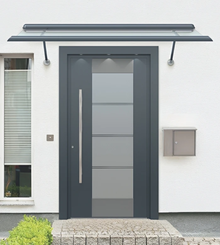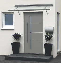 - Optional ist jedes Vordach mit einer LED-Beleuchtung ausstattbar; LED-Beleuchtung ist bei Standardrastermaßen immer in ganzer Vordachbreite durch kalt- oder warmweiße Leuchtdioden im Lichtkanal montiert
